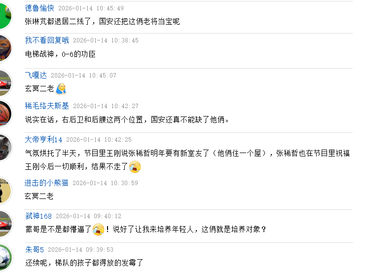 有网友道出球迷感到意外的原因,表示气氛烘托了半天,节目里王刚说张稀哲明年要有新室友了(他俩住一个屋),张稀哲也在节目里祝福王刚今后一切顺利,结果不走了。有人调侃,蒙哥是不是都懵逼了!说好了让我来培养年轻人,这俩就是培养对象?